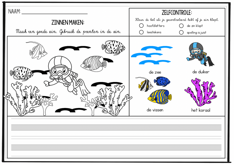 Een leuk bestandje met 9 prenten waarbij de kinderen leren een correcte zin te schrijven. Het bestand bevat 4 verschillende niveaus van moeilijk naar makkelijk. Op deze manier kan je het inzetten en aanpassen naar het niveau van het kind. Het gaat van effectief schrijven tot het matchen van de woorden op de juiste plaats. Veel plezier met het gratis bestandje!